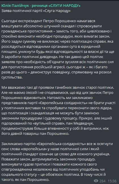 "Мы считаем такие действия проявлением позорных привычек старой политики. Но нет иллюзий и не надеемся, что от этих привычек Петр Порошенко откажется. В то же время мы призываем представителей партии "Европейская солидарность" не участвовать в политических спектаклях и попытаться убедить своего лидера, что политизация и скандализация не могут быть заменой законным процедурам и судебному процессу. Досадно, но другой подозреваемый по "угольному делу", господин Медведчук, продемонстрировал больше уверенности в себе и выдержки, чем его давний товарищ господин Порошенко", - говорится в заявлении.