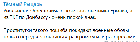 "Увольнение Арестовича с позиции советника Ермака, и из ТКГ по Донбассу - очень плохой знак.