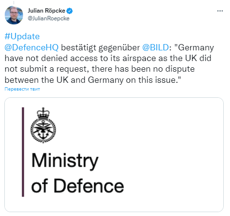 "Германия не отказывала в доступе к своему воздушному пространству, поскольку Великобритания не подавала запрос, между Великобританией и Германией не было спора по этому вопросу", - процитировал он официальный ответ немецкого Минобороны.