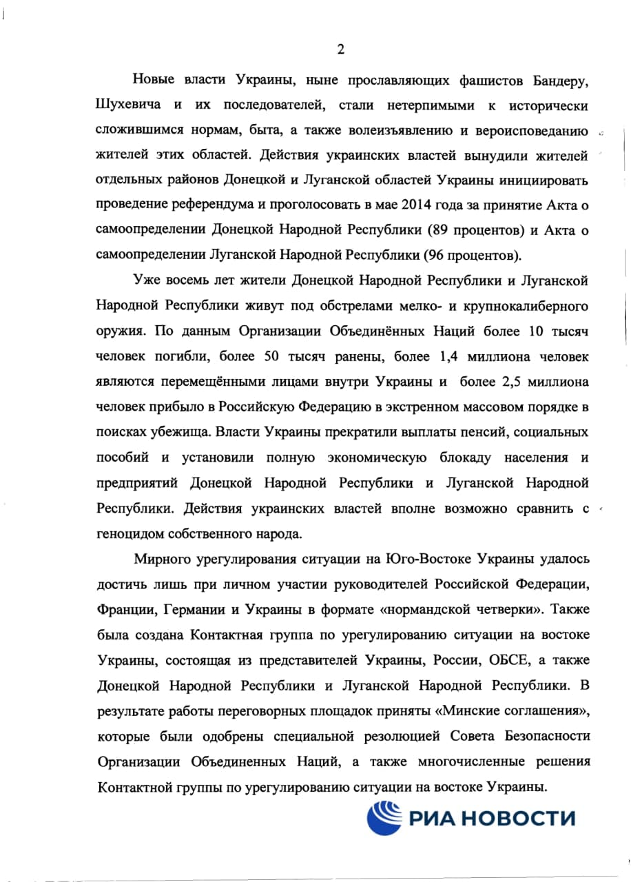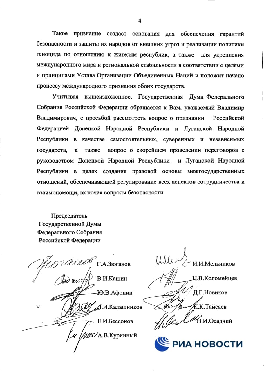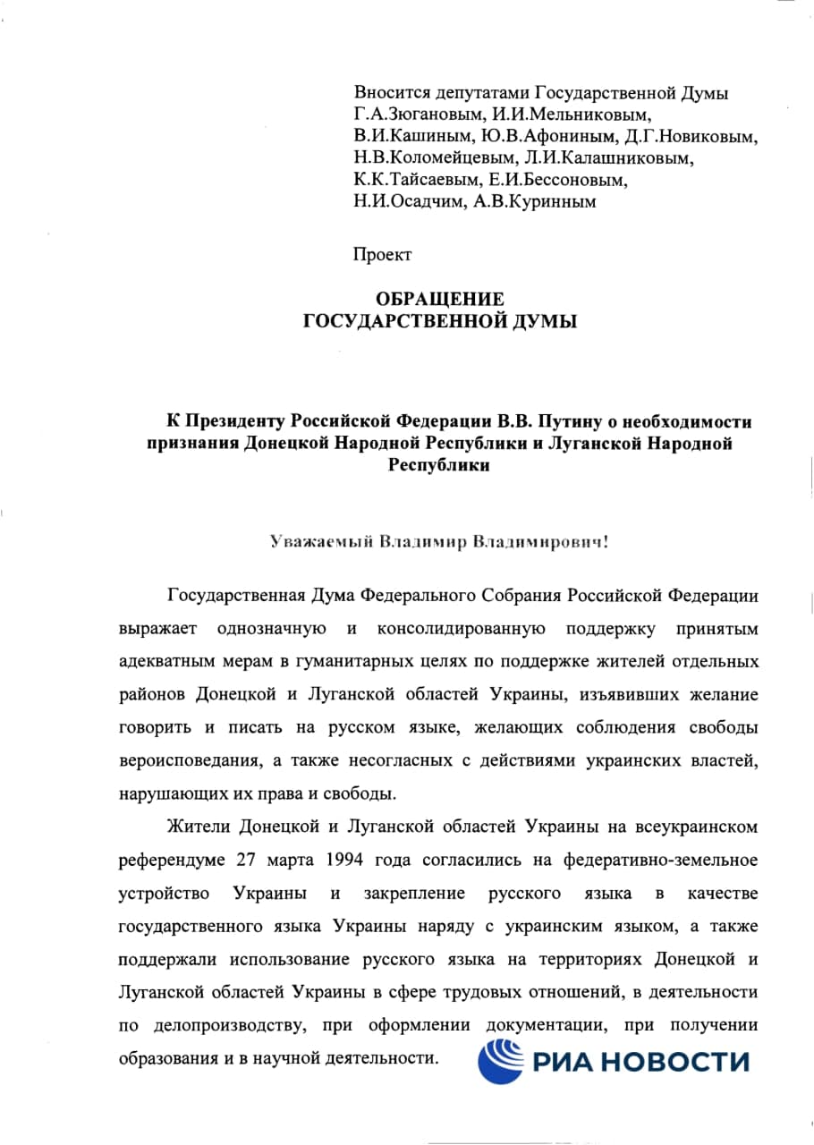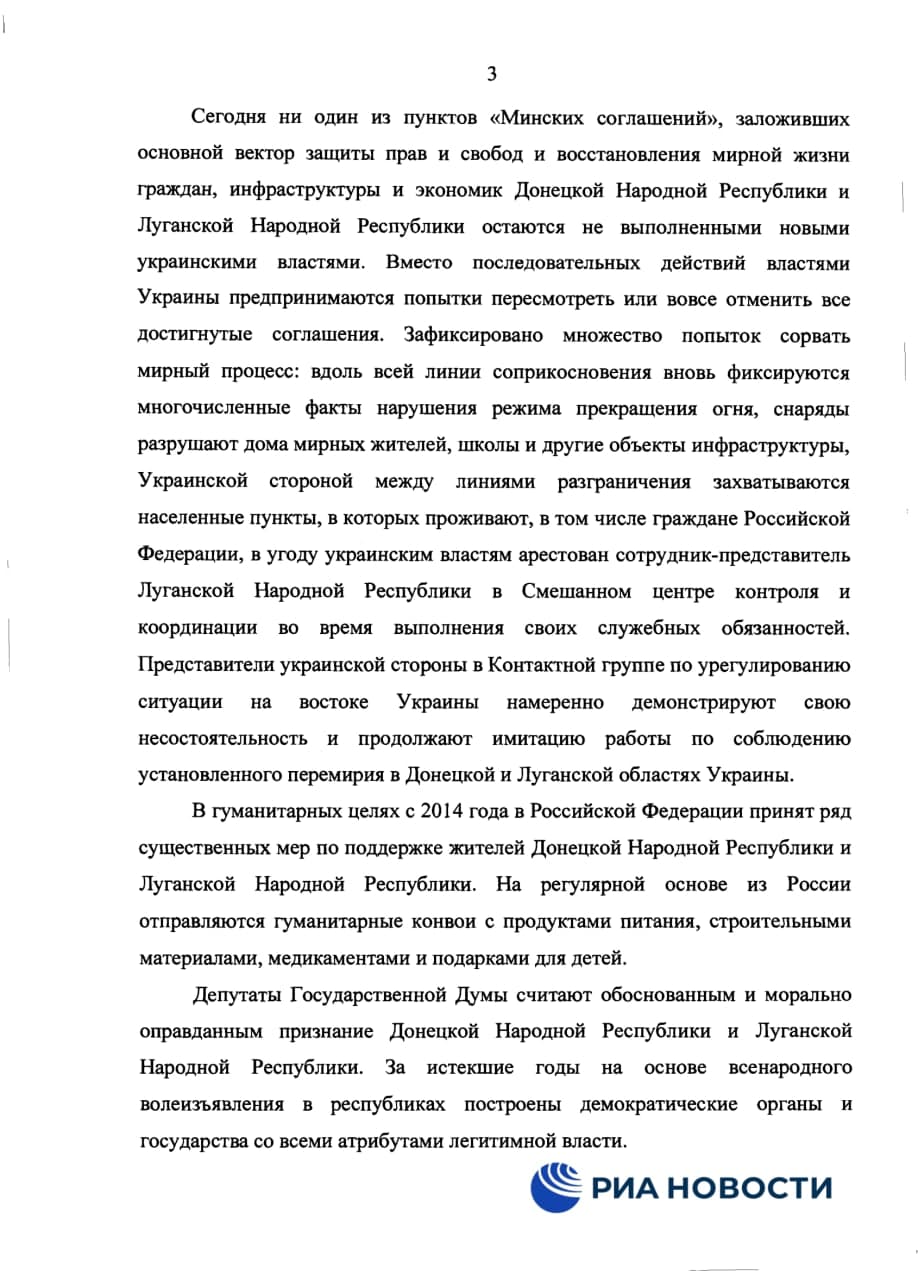 "Депутаты Государственной Думы считают обоснованным и морально оправданным признание Донецкой Народной Республики и Луганской Народной Республики. За истекшие годы на основе всенародного волеизъявления в республиках построены демократические органы и государства со всеми атрибутами легитимной власти", - говорится в документе.