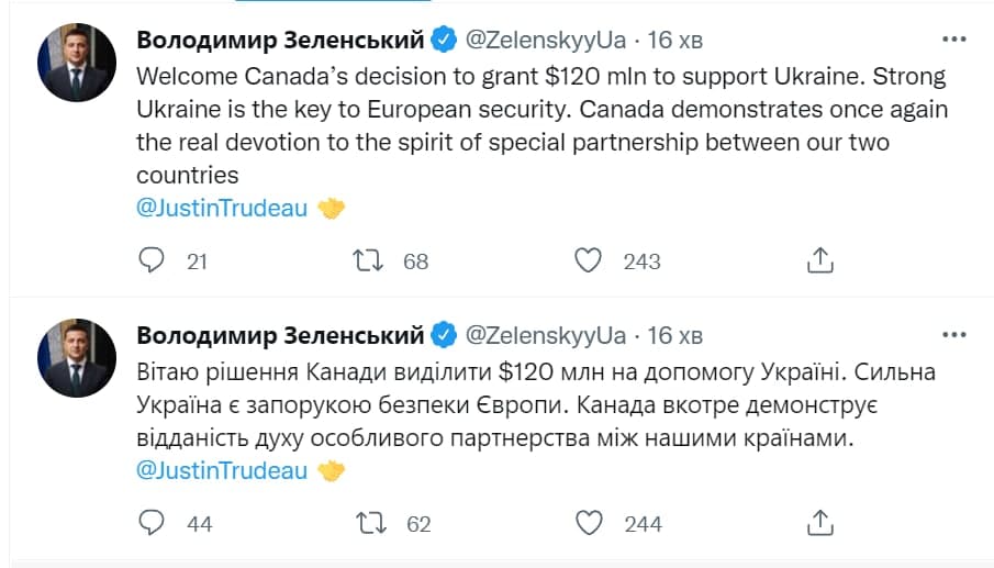 Президент Украины Владимир Зеленский заявил о том, что правительство Канады собирается выделить нашему государству материальную помощь в размере 120 млн канадских долларов (или почти 96 млн долларов США - Ред.). Действующий гарант связывает такое решение с обеспечением безопасности в Европе.
