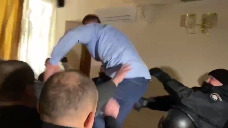 На опубликованных кадрах видно, как нардеп пробегает по столам, со всех сторон к нему тянутся руки, пытающиеся ухватить его за рубашку и удержать "Держите его", - кричит кто-то за кадром.