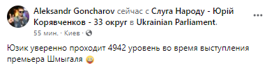 "Юзик уверенно проходит 4942 уровень во время выступления премьера Шмыгаля", - написал журналист и прикрепил фото.