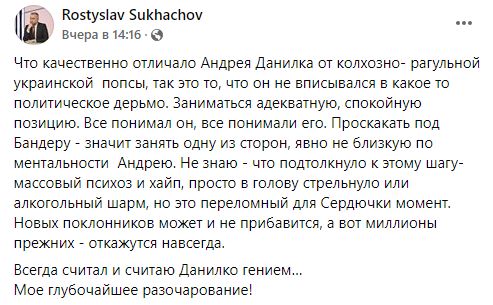 "Что качественно отличало Андрея Данилка от колхозно-рагульной украинской попсы, так это то, что он не вписывался в какое-то политическое дерьмо. Занимал адекватную, спокойную позицию. Все понимал он, все понимали его. Проскакать под Бандеру - значит занять одну из сторон, явно не близкую по ментальности Андрею. Не знаю - что подтолкнуло к этому шагу- массовый психоз и хайп, просто в голову стрельнуло или алкогольный шарм, но это переломный для Сердючки момент.