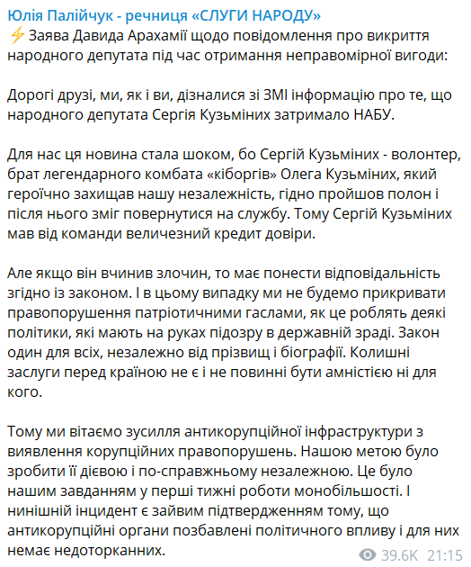 Этого не заявили официально. Но в "Слуге народа" позже заявили, что депутат задержан. Глава фракции Давид Арахамия сказал, что история с Кузьминых стала для партии шоком, поскольку этот нардеп - известный патриот и волонтер.