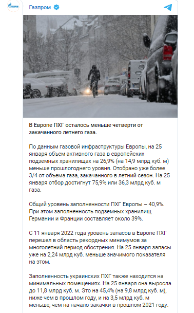 "На 29 января запасы уже на 2,7 млрд куб. м меньше минимального показателя на эту дату", - говорится в сообщении.