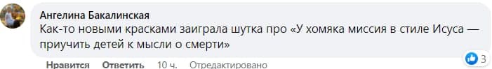 "Как-то новыми красками заиграла шутка про "У хомяка миссия в стиле Исуса — приучить детей к мысли о смерти", - написала журналистка Ангелина Бакалинская.