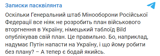 "Поскольку Генеральный штаб Минообороны Российской Федерации все никак не разработает план военного вторжения в Украину, германский таблоид Bild опубликовал свой план. Это правильно. Потому что, например, вздумает Путин напасть на Украину и что ему делать без плана? А теперь есть хоть какой-то", - иронизирует журналист Владимир Бойко.