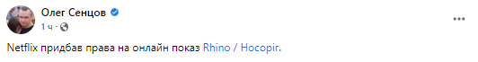 Сенцов заявил, что Netflix выкупил права на онлайн-показ его фильма "Носорог"