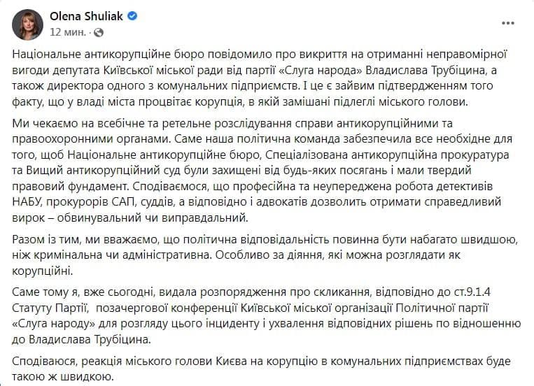 Также она сообщила, что сегодня распорядилась созвать внеочередную конференцию Киевской городской организации "Слуги народа" для рассмотрения инцидента и принятия решения по отношению к Трубицину.