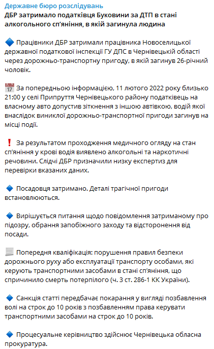"По предварительной информации, 11 февраля 2022 года около 21:00 в селе Припрутье Черновицкой области налоговик на собственном авто допустил столкновение с другим автомобилем, водитель которого в результате возникшего дорожно-транспортного происшествия погиб на месте происшествия", - говорится в записи.