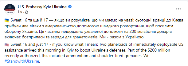 "Сегодня утром в Киев прибыли два самолета с американской помощью быстрого развертывания, чтобы усилить оборону Украины. Эта часть недавно принятой помощи на 200 миллионов долларов включает в себя боеприпасы и заряды для гранатометов. Мы – вместе с Украиной", — говорится в сообщении.