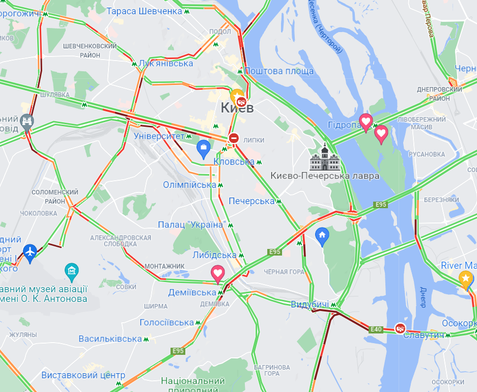 Это плюс-минус то же время, которое автомобилисты тратят на проезд с левого берега на правый и всегда. И даже в полдень, когда час-пик схлынул, правый берег Киева во многих местах остается "красным".