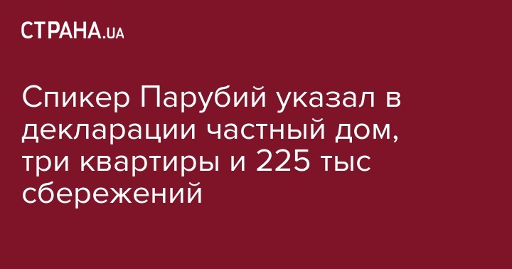 В декларации Парубий указал, что его супруга Ульяна владеет квартирой площадью 21,60 квадратных метров, которая расположена во Львове, а также земельным участком площадью 1130 квадратных метров. Во Львове у нее значится еще одна квартира площадью 142,60 квадратных метров.