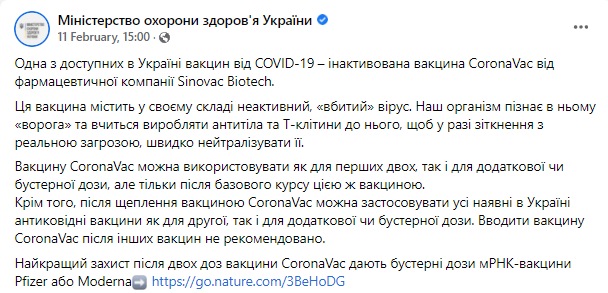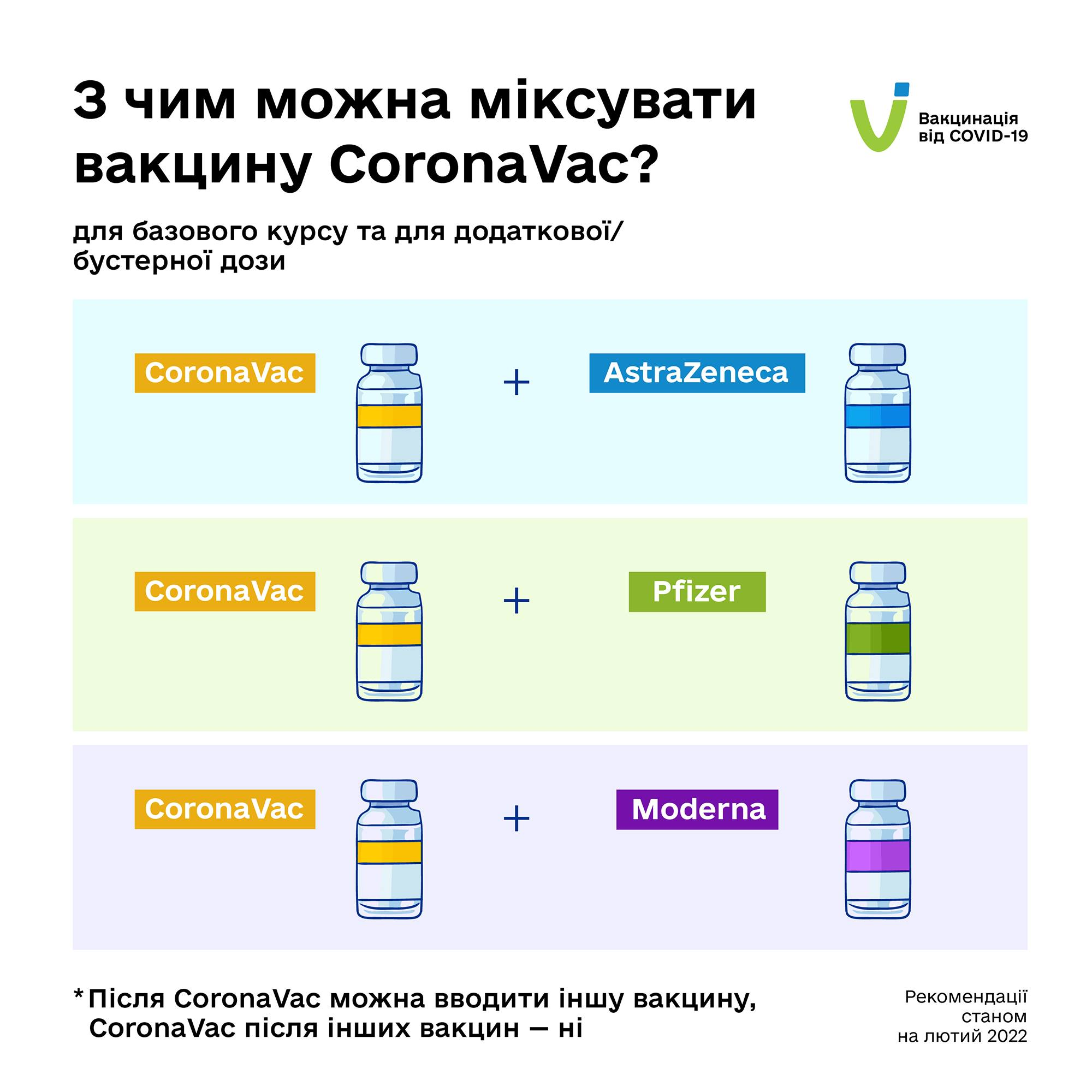 Кроме того, после прививки вакциной CoronaVac можно применять все имеющиеся в Украине антиковидные вакцины как для второй, так и для дополнительной или бустерной дозы.