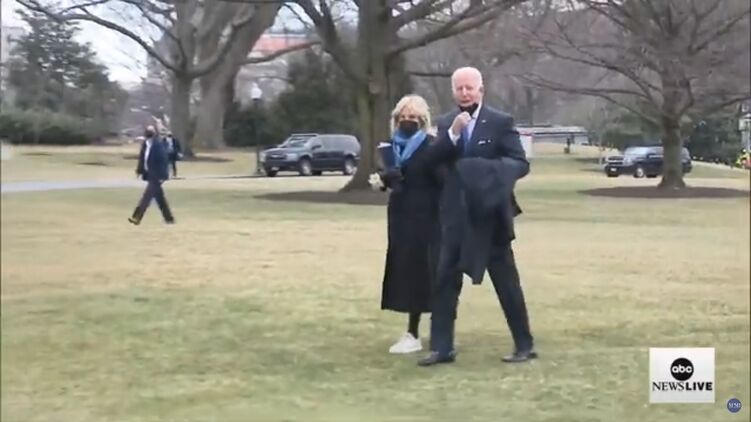 Держа за руку супругу Джил, Байден вышел из вертолета, который доставил президентскую чету в Белый дом после выходных в загородной резиденции Кемп-Дэвид.