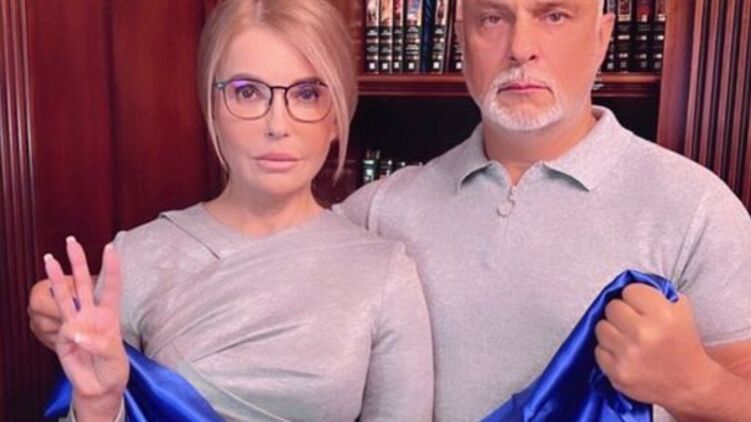 В "день вторжения" Тимошенко с мужем позировали с флагом Украины и тризубом из пальцев. Фото