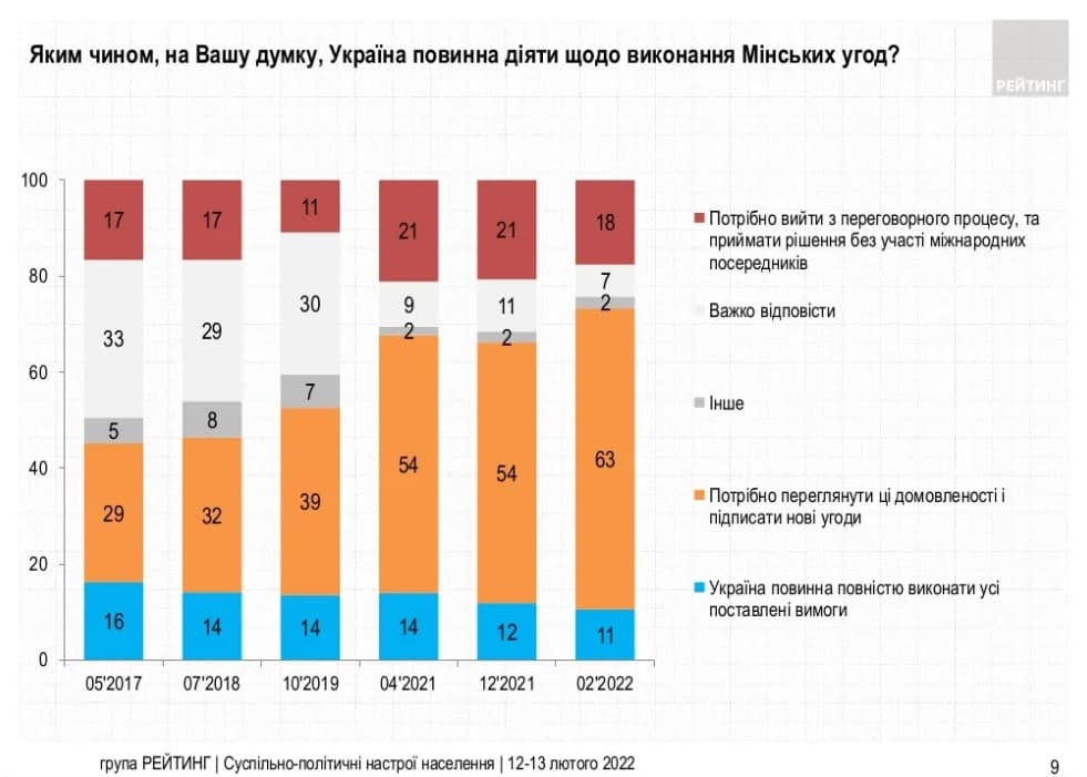 По данным социологов, 11% считают, что Украина должна выполнить все требования. 18% считают, что Украина должна выйти из переговорного процесса вообще. При этом, по данным "Рейтинга", число сторонников пересмотра соглашений за последние годы увеличилось.