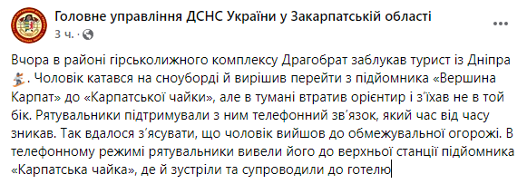 Спасатели поддерживали с ним телефонную связь, которая время от времени исчезала. Однако в процессе разговора удалось выяснить, что мужчина вышел к ограничительному забору. В телефонном режиме они вывели заблудившегося на верхнюю станцию ​​подъемника "Карпатская чайка", где его встретили и сопроводили в гостиницу.