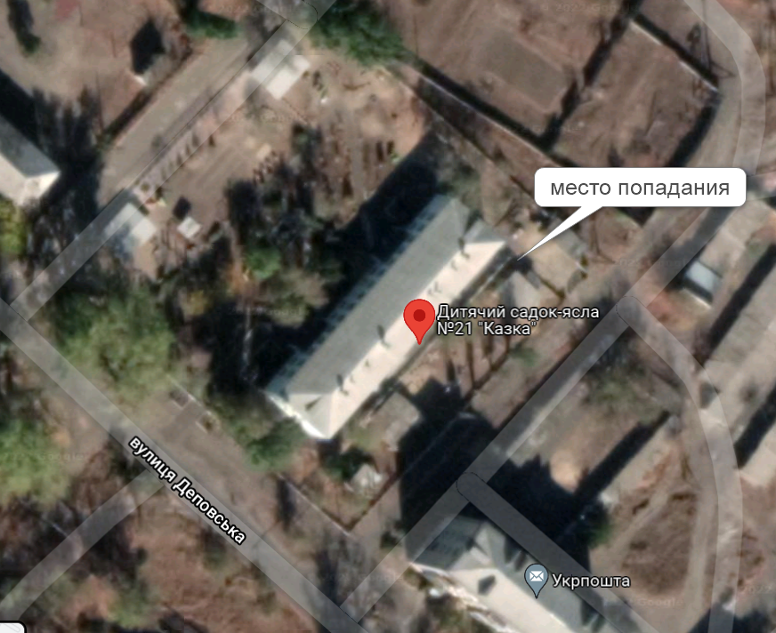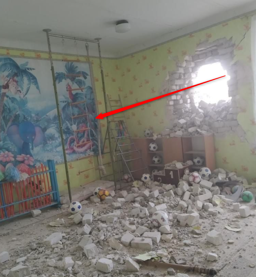 Откуда там взялись повреждения - вообще непонятно. Найденная миссией воронка к юго-западу от садика, конечно, в теории, могла вызвать такие последствия. Но тогда неясно, почему остались целыми окна собственно на юго-западной части здания.