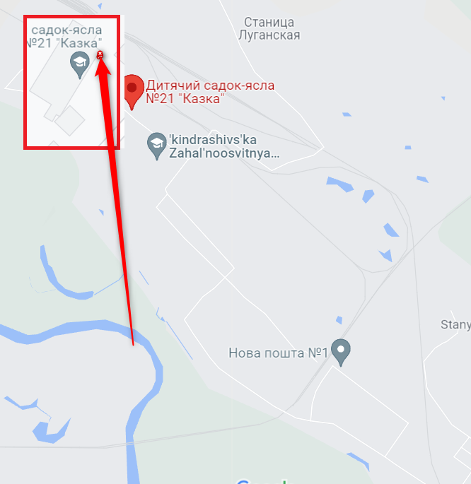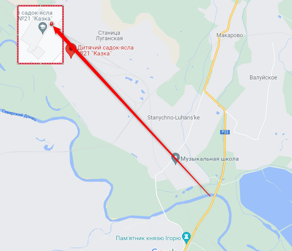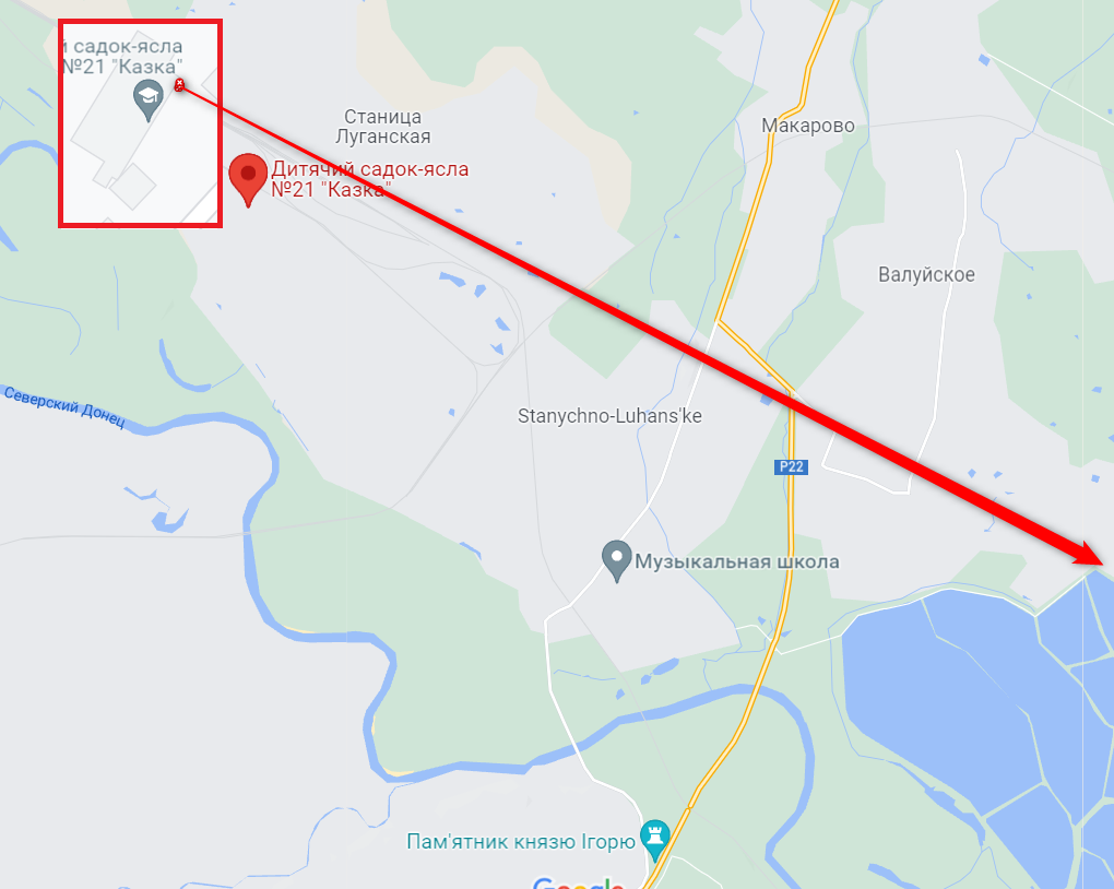 Отметим, что северо-восточная стена детского сада вообще не "смотрит" на позиции "Луганской народной республики", которые идут по реке Северский Донец.