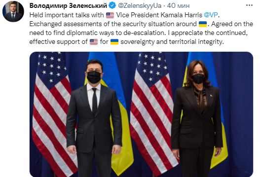 "Провел важные переговоры с вице-президентом США Камалой Харрис. Обменялись оценками ситуации с безопасностью вокруг Украины. Договорились о необходимости поиска дипломатических путей деэскалации. Я ценю постоянную и эффективную поддержку США суверенитета Украины и территориальной целостности" - говорится в твите украинского президента.