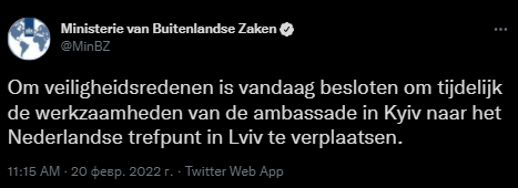 Как пишут местные СМИ, в МИД Нидерландов не могут сказать, сколько сотрудников посольства все еще остаются в Киеве. Часть сотрудников уже переехала во Львов после того, как неделю назад там открыли центр поддержки.