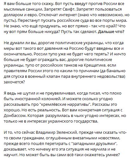 Не думали ли вы, дорогие политические украинцы, что когда меры вот такого вот давления на Россию будут введены все и окончательно, России тупо уже не будет чего терять? И ничто больше не будет ограждать вас, дорогие политические украинцы, тупо от российских танков на Крещатике, если правителям России этого по каким-то причинам (да банально для спуска в военный клапан пара внутреннего недовольства) захочется?
