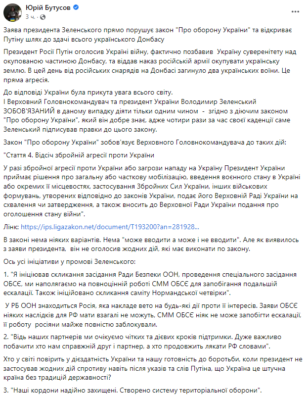 Главред сайта "Цензор" Юрий Бутусов потребовал у Зеленского разорвать дипломатические отношения с Россией, начать частичную мобилизацию, ввести военное положение на Донбассе, установить визовый режим с Россией и обратиться к НАТО с просьбой о немедленной военной помощи.