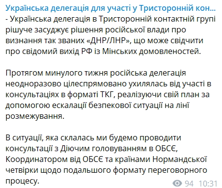 Украинская делегация в ТКГ, как и президент, заявила, что признание "может" говорить о выходе РФ из Минских соглашений. При этом делегаты заявили, что продолжат консультации как с ОБСЕ, так и с Нормандской четверкой - то есть, в том числе и с Россией, которая в указанных организациях присутствует.