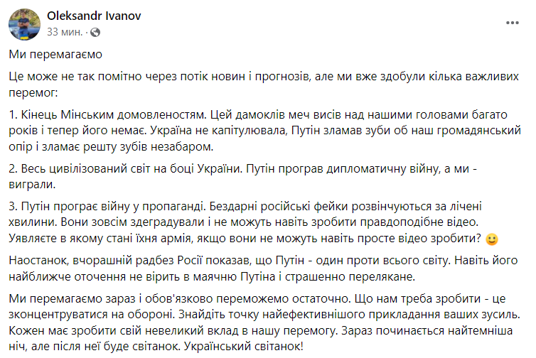 "Этот дамоклов меч висел над нашими головами много лет, и теперь его нет. Украина не капитулировала, Путин сломал зубы о наше гражданское сопротивление и сломает все остальные зубы вскоре", - пишет член "Руха опору капитуляции" Александр Иванов.