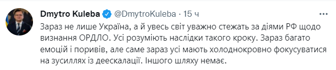"Признание двух сепаратистских территорий в Украине является вопиющим нарушением международного права, территориальной целостности Украины и минских соглашений. ЕС и его партнеры дадут единый, твердый и решительный ответ в знак солидарности с Украиной", - говорится в твите главного дипломата ЕС.