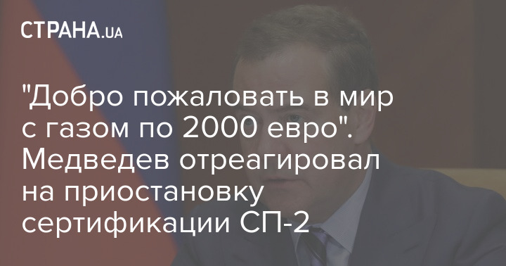 "Канцлер ФРГ Олаф Шольц поручил остановить сертификацию газопровода "Северный поток 2". Ну что ж. Добро пожаловать в новый мир, в котором уже скоро европейцы будут платить 2000 евро за тысячу кубов газа!" - написал Медведев в Twitter.
