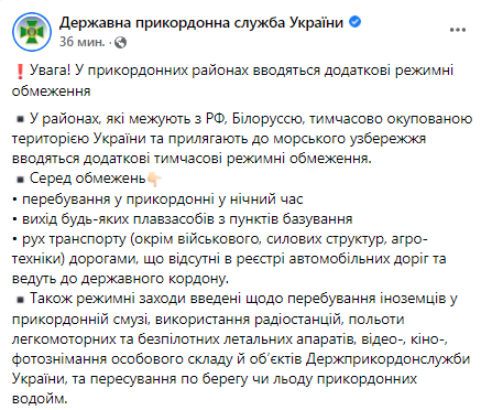 Также режимные мероприятия введены относительно пребывания иностранцев в пограничной полосе, использования радиостанций, полеты легкомоторных и беспилотных летальных аппаратов, видео-, кино-, фотосъемки личного состава и объектов Госпогранслужбы Украины, и передвижение по берегу или льду пограничных водоемов.