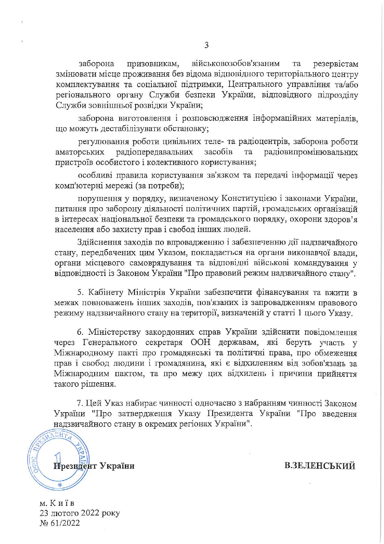 На сайте Верховной Рады опубликовали текст указа президента Владимира Зеленского о чрезвычайном положении в Украине. Оно должно быть введено с полуночи 24 февраля на 30 суток.
