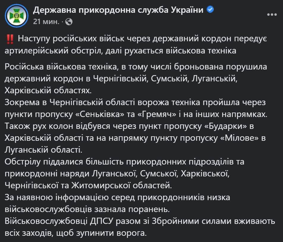 "Наступлению российских войск через государственную границу предшествует артиллерийский обстрел, далее движется военная техника. Российская военная техника, в том числе бронированная, нарушила государственную границу в Черниговской, Сумской, Луганской, Харьковской областях", - сообщили пограничники.