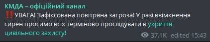 "Внимание! Зафиксирована воздушная угроза! В случае включения сирен просим всех срочно последовать в укрытия гражданской защиты!" - сообщили в КМДА.
