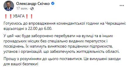 По словам Скичко, Черкасская область готовится к внедрению комендантского часа в Черкасской области: с 22:00 до 06:00.