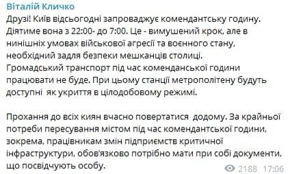 "Это вынужденный шаг, но в нынешних условиях военной агрессии и военного положения, необходимый для безопасности жителей столицы. Общественный транспорт во время коменданского часа работать не будет. При этом станции метрополитена будут доступны в виде укрытия в круглосуточном режиме.