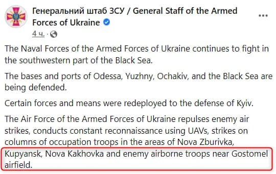 При этом по состоянию на три часа ночи Генштаб сообщал, что ВСУ отражают удары авиации и десант противника в районе аэродрома Гостомель.
