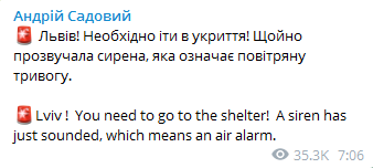 "Львов! Необходимо идти в укрытие! Только что прозвучала сирена, которая означает воздушную тревогу", - говорится в сообщении мэра Львова Андрея Садового в Telegram.