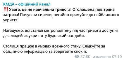 "Внимание, это не учебная тревога! Объявлена воздушная угроза! Услышав сирены, немедленно направляйтесь в ближайшее укрытие!" - сообщает КГГА.