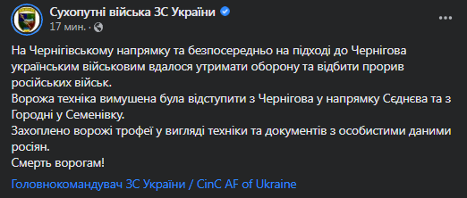"На Черниговском направлении и непосредственно на подходе к Чернигову украинским военным удалось удержать оборону и отразить прорыв российских войск. Вражеская техника была вынуждена отступить из Чернигова в направлении Седнева и из Городни в Семеновку. Захвачены вражеские трофеи в виде техники и документов с личными данными россиян", - говорится в сообщении.