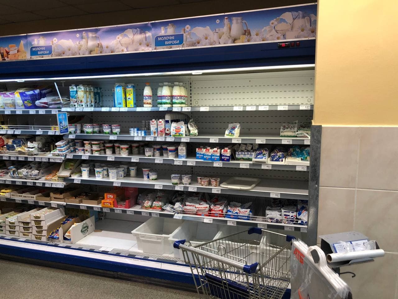 Появились фото продуктовых магазинов Киева, в которых размели хлеб и воду