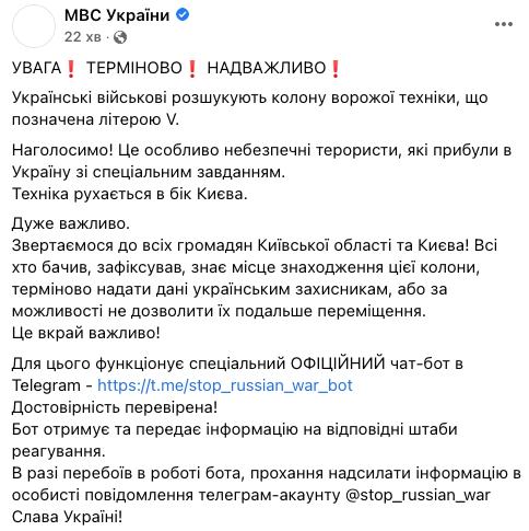 "Украинские военные ищут колону вражеской техники, обозначенную буквой V. Это особо опасные террористы, прибывшие в Украину со специальным заданием. Техника движется в сторону Киева. Очень важно", - говорится в сообщении.
