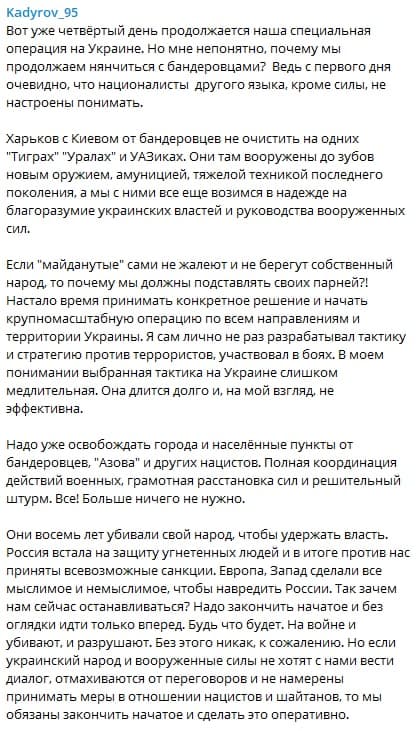 Я прошу руководство страны, Верховного Главнокомандующего Вооруженными силами России Владимира Путина дать всем спецподразделениям соответствующий приказ, чтобы они смогли закончить с нацистами", - заявил Кадыров.