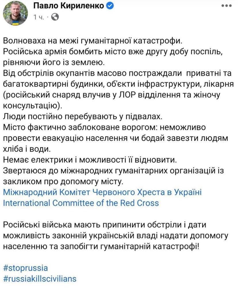 20:40 Очень странное и опасное заявление Кличко о том, что Киев окружён (об этом вообще никто, кстати, из военных не заявляет) и что в связи с этим эвакуация невозможна (если, конечно, журналисты правильно поняли его слова).