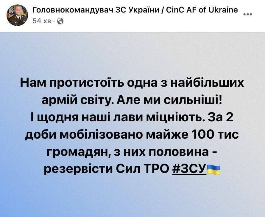 19:11 Главком ВСУ заявил, что за двое суток мобилизовано 100 тысяч украинцев. Из них половина - в тероборону.