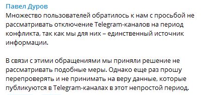 "Мы не хотим, чтобы Telegram использовался как инструмент, усугубляющий конфликты и разжигающий межнациональную рознь. В случае эскалации ситуации мы рассмотрим возможность частично или полностью ограничить работу Telegram-каналов в вовлеченных странах на время конфликта", - написал Дуров.