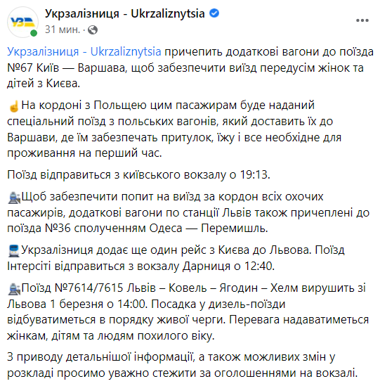 Укрзализныця на своем сайте отмечает, что приоритетная посадка на эвакуационные поезда — для матерей с детьми. Билет не нужен, только паспорт и свидетельства о рождении детей. Посадка идет в порядке живой очереди.